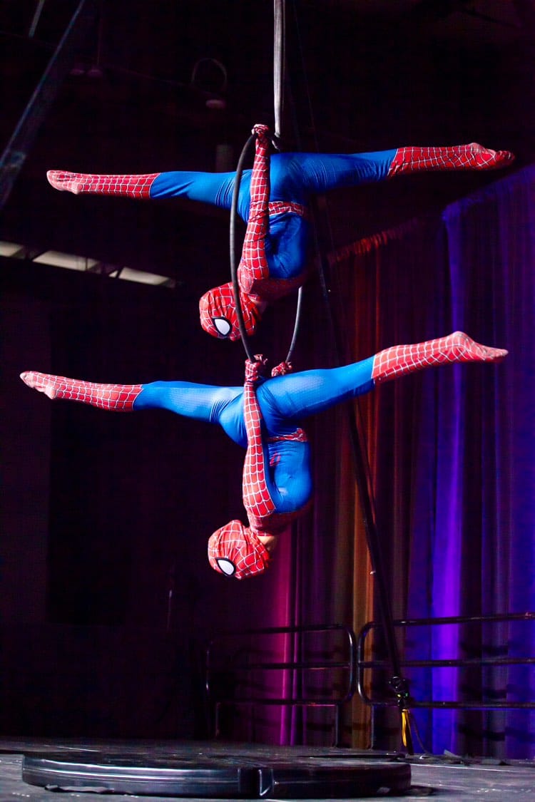 ValerieAuCiel brought childhood superhero dreams to life at Comic-Con with an energetic Spider-Man-themed aerial hoop routine alongside Cirquonscient.