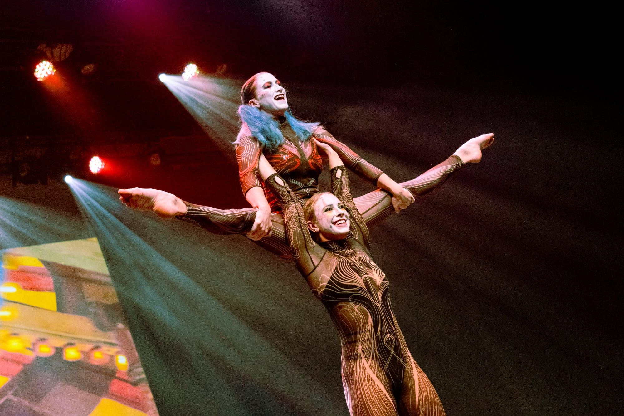 Duo acrobatics, contortion, partner dance, and contact fire show